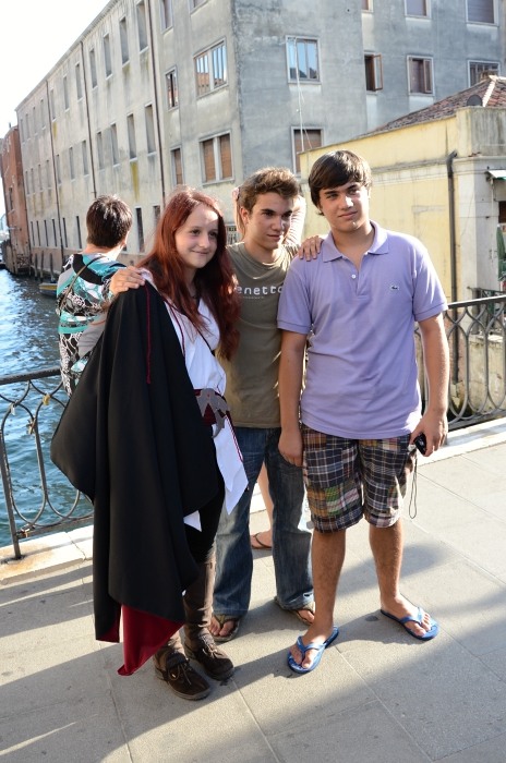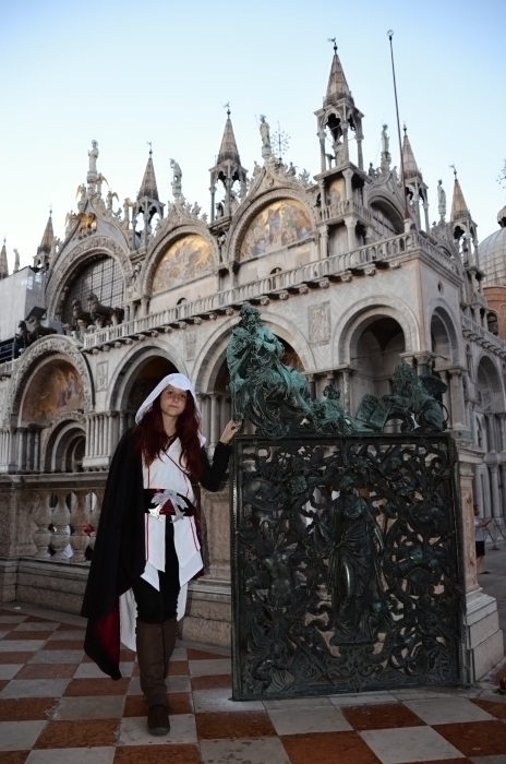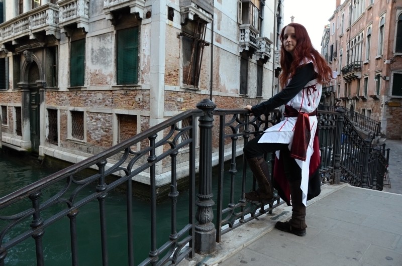 Myslím, že v prístave a na námestí San Marco sa masy turistov pozerali skôr ako na miestnu atrakciu a boli sme radi, že nás nepristavujú kvôli fotke. Až putovanie bočnými uličkami dali všetkému to čaro. Okoloidúci si ju pozerali, upozorňovali sa navzájom na ňu a v rôznych jazykoch medzi sebou niečo komentovali. Našli sa aj taký, ktorý nahlas vyslovili Ezio alebo Ezio Auditore. Mala radosť vždy keď niekto jej poznavu spoznal. Teda výnimku zaklincovala jedna slečinka, ktorá povedla: „D´artagnan“.