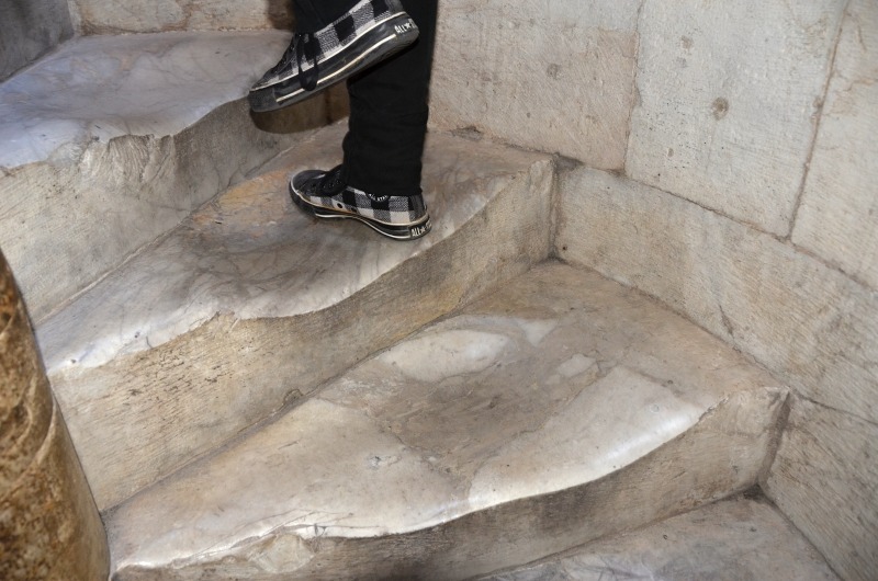 Pred dvanástou už čakáme na vstup pri veži. Pri stúpaní po mramorových schodoch veže si uvedomujeme ako moc je vlastne naklonená. Či chcete alebo nie, točité schodisko vám vykláňa a opierate sa raz o vnútornú stenu, raz o vonkajšiu. Podľa toho na ktorej strane špirálovitého schodiska sa práve nachádzate. Je to veľmi smiešne a ten pocit je naozaj zvláštny. Mramorové schody si už musia pamätať milióny párov nôh, ktoré po nich kráčali. Je to na nich aj pekne vidieť.