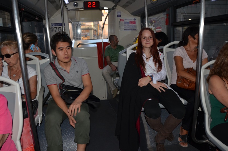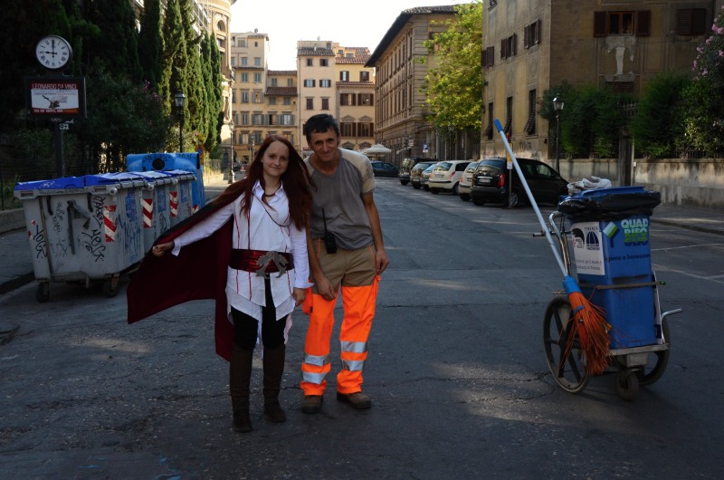 Oproti Benátkam si tu Sonku prezeralo trochu nechápavo oveľa viac ľudí. Niet sa čo čudovať, cestovali sme mestskou hromadnou dopravou a centrum mesta je preľudnené. Zastavuje sa pri nás zametač ulíc, ktorý sa začne pýtať z akého dôvodu je tak oblečená keď je vonku tak teplo. Logická otázka pretože dnes je opäť tropická horúčava 39 stupňov. Snažíme sa mu vysvetliť, že ide o autentický odev a chce navštíviť miesta po ktorých Ezio v minulosti chodil. Pýtal sa odkiaľ sme. Samozrejme Slovensko nepoznal akurát sa opýtal, či tam takýto odev nosíme bežne. Naozaj nás pobavil a tak ho žiadam o spoločnú fotografiu.